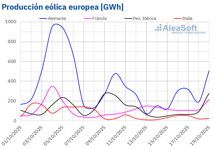 En la semana del 20 de octubre, según las previsiones de producción eólica de AleaSoft Energy Forecasting, se espera que la producción con esta tecnología aumente significativamente en los principales mercados europeos.