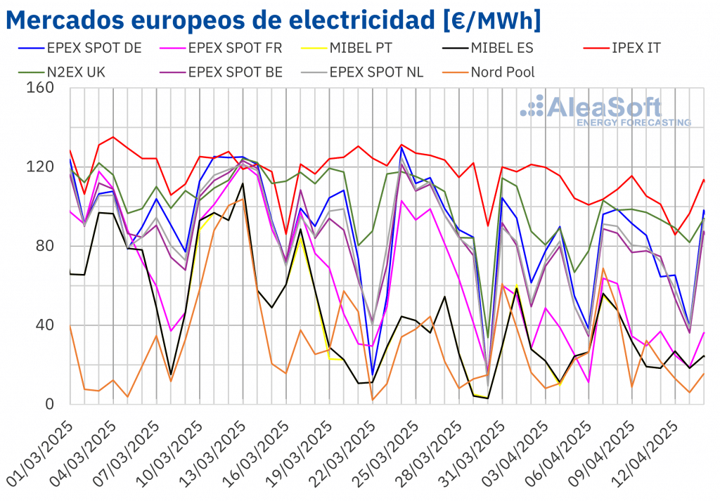 AleaSoft Energy Forecasting, 14 de abril de 2025. En la segunda semana de abril, los precios de los principales mercados eléctricos europeos se mantuvieron en niveles similares a los de la semana anterior, con promedios semanales algo superiores. El descenso de la producción eólica favoreció este comportamiento. En cambio, la solar fotovoltaica aumentó y alcanzó […]