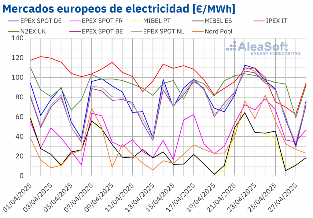 AleaSoft Energy Forecasting, 29 de abril de 2025. En la semana del 21 de abril, los precios de la mayoría de los principales mercados eléctricos europeos aumentaron en comparación con la semana anterior, especialmente durante los primeros días de la semana. El descenso de la producción eólica impulsó las subidas. A finales de semana los […]
