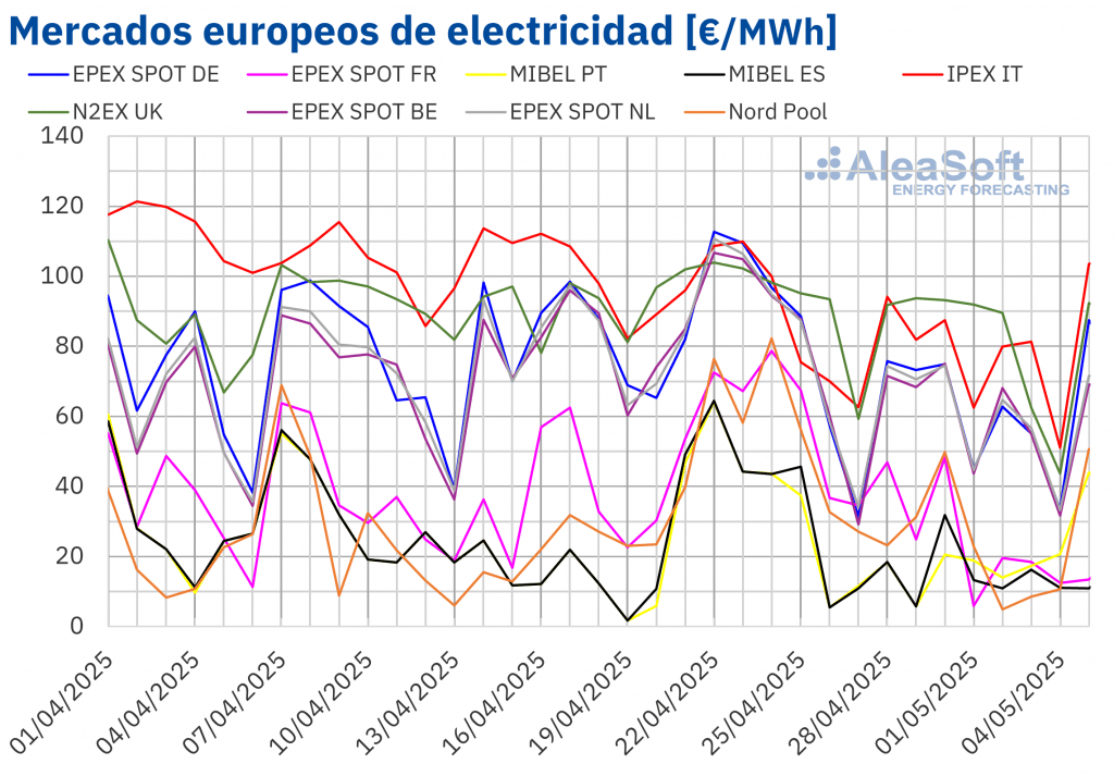 AleaSoft Energy Forecasting, 7 de mayo de 2025. En abril, los principales mercados eléctricos europeos registraron sus precios mensuales más bajos desde al menos noviembre de 2024, situándose en la mayoría de los casos por debajo de los 80 €/MWh. El descenso de los precios del gas, cuyos futuros alcanzaron el menor promedio mensual desde agosto […]
