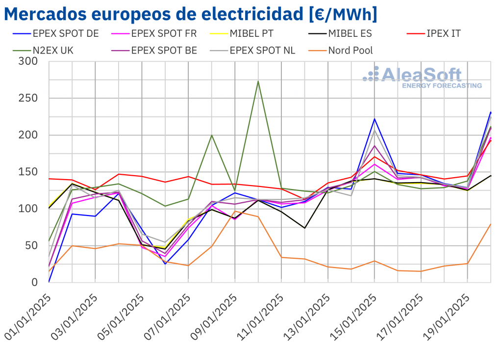 AleaSoft Energy Forecasting, 20 de enero de 2025. En la tercera semana de enero, los precios de la mayoría de los principales mercados eléctricos europeos subieron, impulsados por la menor producción eólica, el aumento de la demanda debido a temperaturas más frías y el alza de los precios del gas y CO2. El 17 de […]