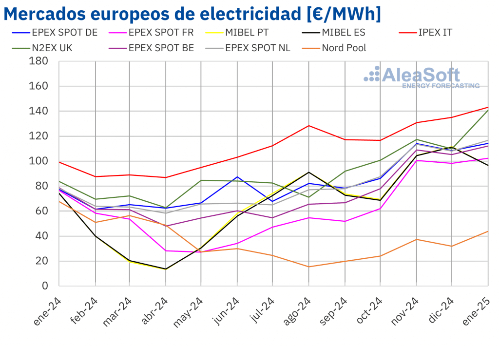 AleaSoft Energy Forecasting, 4 de febrero de 2025. En enero de 2025, los precios de la mayoría de los principales mercados eléctricos europeos subieron, alcanzando algunos su promedio mensual más alto desde marzo de 2023. Este aumento sigue la tendencia de los precios del gas, cuyos futuros marcaron su mayor valor mensual desde entonces, y […]