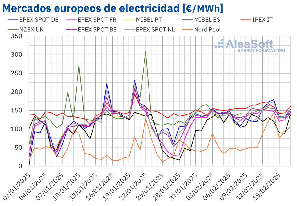 AleaSoft Energy Forecasting, 17 de febrero de 2025. En la segunda semana de febrero, los precios de la mayoría de los principales mercados eléctricos europeos subieron y superaron los 140 €/MWh de promedio semanal. Sin embargo, en el mercado ibérico, el aumento de la producción eólica y el descenso de la demanda eléctrica favorecieron el descenso […]