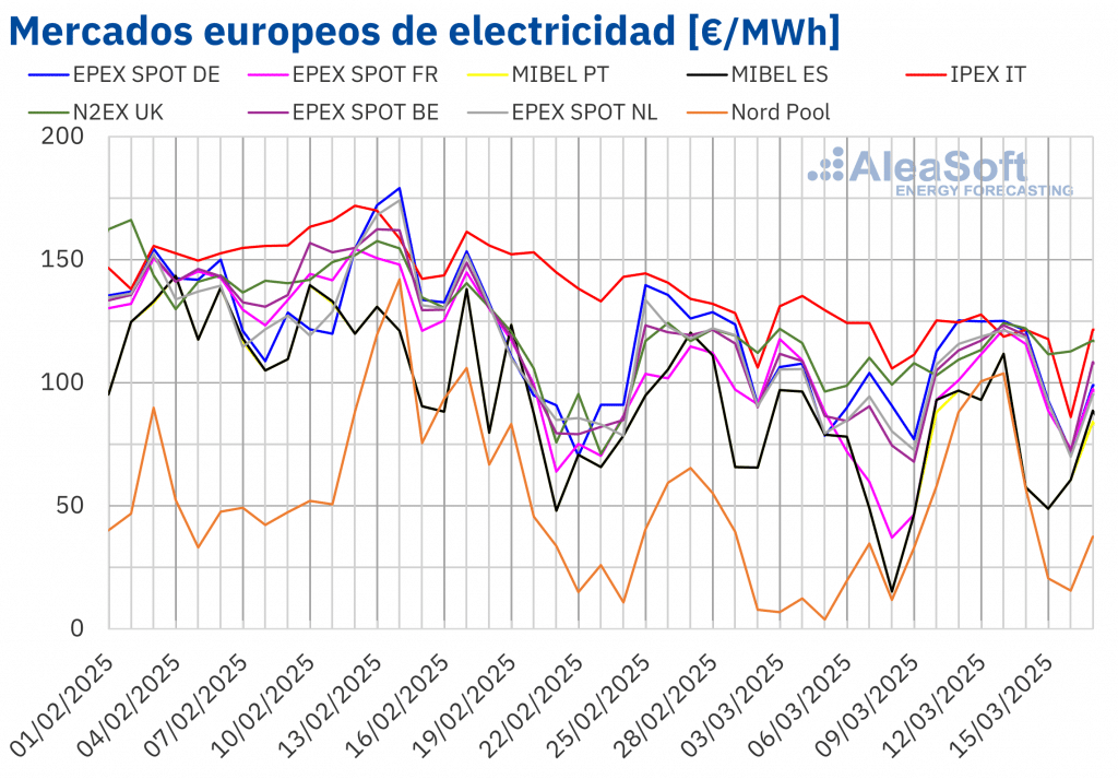 AleaSoft Energy Forecasting, 17 de marzo de 2025. En la segunda semana de marzo, los precios semanales de la mayoría de los principales mercados eléctricos europeos superaron los 100 €/MWh y fueron superiores a los de la semana anterior. Este comportamiento estuvo favorecido por el aumento de la demanda eléctrica, asociado con temperaturas más frías, y […]
