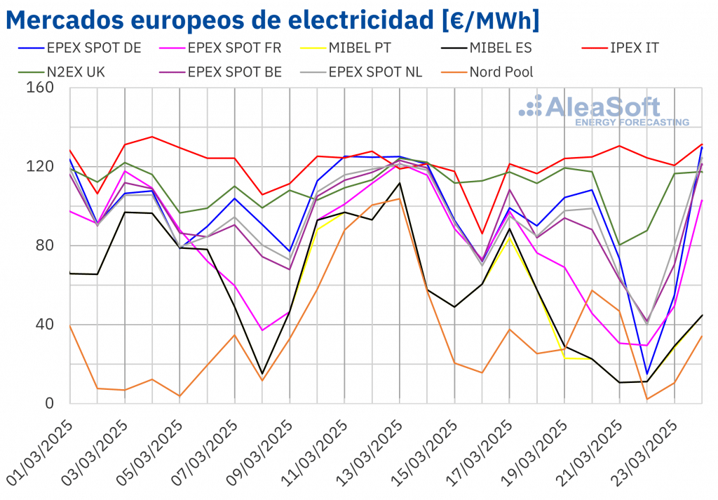AleaSoft Energy Forecasting, 24 de marzo de 2025. En la tercera semana de marzo, los precios semanales de la mayoría de los principales mercados eléctricos europeos bajaron, situándose por debajo de los 85 €/MWh, después de haber superado los 100€/MWh la semana anterior. Casi todos los mercados registraron el precio diario más bajo desde al menos […]