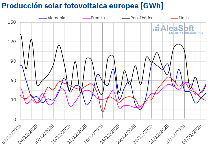 En la semana del 29 de diciembre, la producción solar fotovoltaica aumentó un 38% en el mercado francés y un 16% en el mercado italiano, en ambos casos por segunda semana consecutiva. En cambio, tras los aumentos de la semana anterior, la producción solar disminuyó un 13% en Portugal y un 4,9% en España.