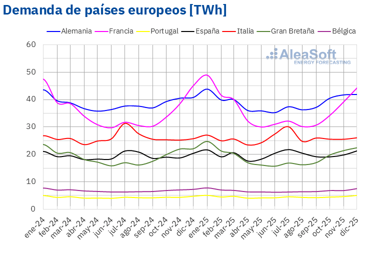 Source: Prepared by AleaSoft Energy Forecasting using data from ENTSO-E, RTE, REN, Red Eléctrica and TERNA.Electricity demand