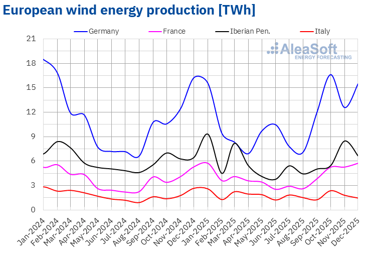 Source: Prepared by AleaSoft Energy Forecasting using data from ENTSO-E, RTE, REN, Red Eléctrica and TERNA.Wind energy production increased in December 2025 in most major European electricity markets compared to December 2024. France registered the largest increase, 8.2%, followed by Portugal with 7.5%, while Spain registered the smallest rise, 1.8%. Italy and Germany were the exception, registering declines of 45% and 4.8%, respectively, in their wind energy production.