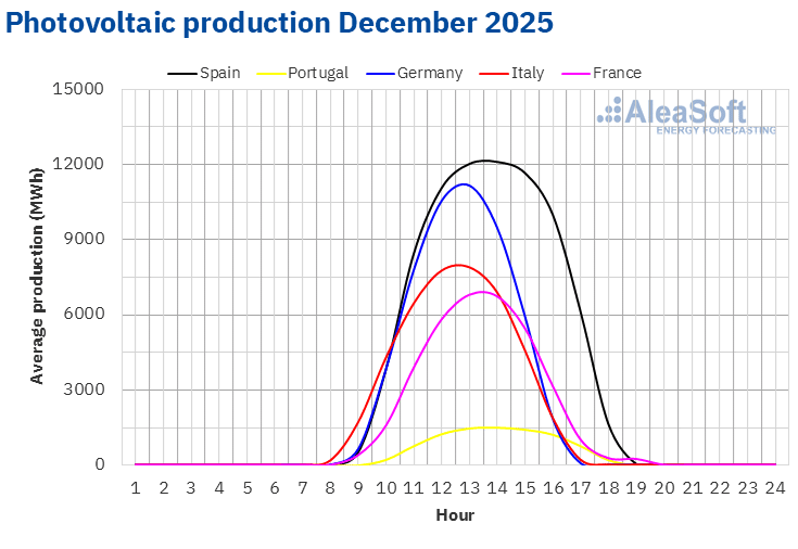 Several of the main European markets registered all‑time records for solar photovoltaic energy production for a December month. Germany reached the highest production, with 1588 GWh, followed by Italy with 1292 GWh and France with 1093 GWh.