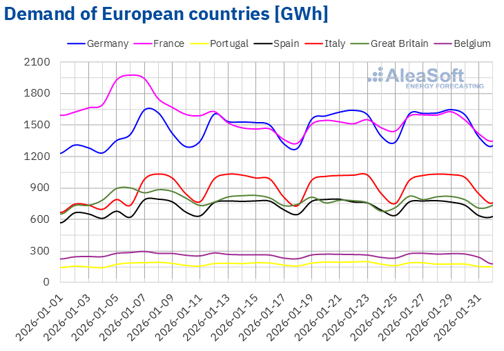 For the first week of February, according to AleaSoft Energy Forecasting’s demand forecasts, demand will increase in Great Britain, Belgium and Spain. In contrast, demand will decline in Germany, Portugal, Italy and France.