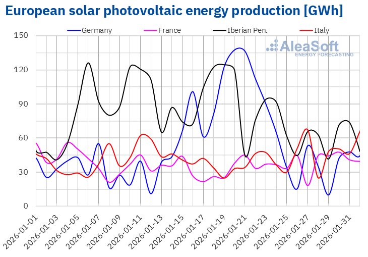 During the week of January 26, solar photovoltaic energy production increased in the French and Italian markets compared to the previous week. Italy registered the largest increase, 41%, while France registered its second consecutive weekly increase, with growth of 13%. In contrast, the Iberian markets and the German market registered declines in generation from this technology. Portugal and Spain continued their downward trend for a third consecutive week, with drops of 30% and 34%, respectively. The German market registered the largest decline, 64%, after showing an upward trend during the previous two weeks.