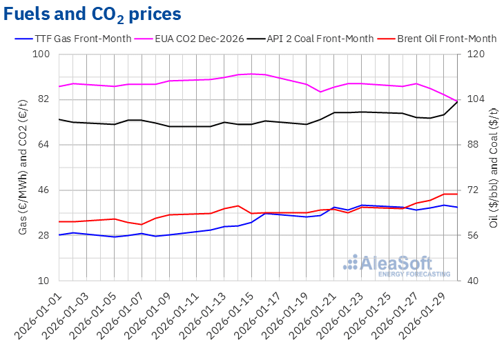 Regarding settlement prices of CO2 emission allowance futures in the EEX market for the reference contract of December 2026, they remained below €90/t during the last week of January. On Tuesday, January 27, these futures reached their weekly maximum settlement price, €88.37/t. Prices then declined and on Friday, January 30, these futures registered their weekly minimum settlement price, €81.26/t. According to data analyzed at AleaSoft Energy Forecasting, this price was 8.1% lower than the previous Friday and the lowest since November 1, 2025.