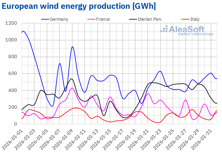 Source: Prepared by AleaSoft Energy Forecasting using data from ENTSO-E, RTE, REN, Red Eléctrica and TERNA.In the last week of January, wind energy production increased in most major European markets compared to the previous week. The Italian market registered the largest increase, 14%, while the Portuguese market registered the smallest rise, 10%. Both markets maintained their upward trend for a second consecutive week. Wind energy production also increased in the German market, with a rise of 13%, reversing the downward trend registered over the previous three weeks. In the Spanish market, wind energy production remained close to the previous week’s level, with a slight decrease of 2.5%, while France registered a 32% drop compared to the previous week.