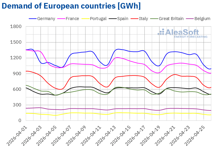 AleaSoft Energy Forecasting’s demand forecasts for the week of April 27 point to lower demand in the French, Belgian, German, Italian, Spanish and Portuguese markets, mainly because much of continental Europe will observe the May 1 International Workers’ Day holiday. In the British market, demand will increase.