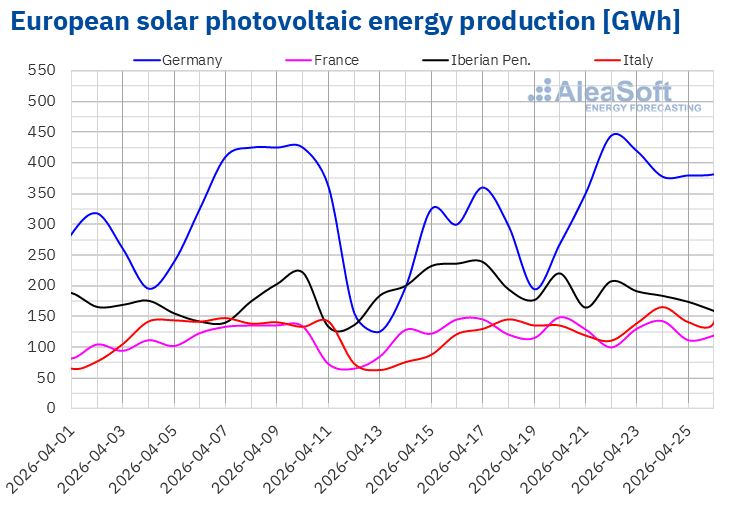 According to AleaSoft Energy Forecasting’s solar energy forecasts for the week of April 27, solar energy production will increase in the Italian, German and Spanish markets.