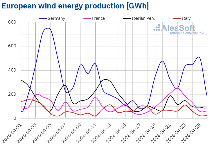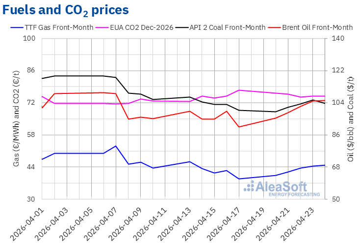 Regarding CO2 emission allowance futures in the EEX market for the reference contract of December 2026, they registered their weekly maximum settlement price, €76.15/t, on Monday, April 20. That level already stood 1.7% below the previous Friday and prices continued to move lower until April 22. On that day, these futures registered their weekly minimum settlement price, €74.42/t. In the last two sessions of the week, settlement prices recovered slightly but remained below €75/t. On Friday, April 24, the settlement price stood at €74.91/t. According to data analyzed at AleaSoft Energy Forecasting, this price was 3.3% lower than the previous Friday.