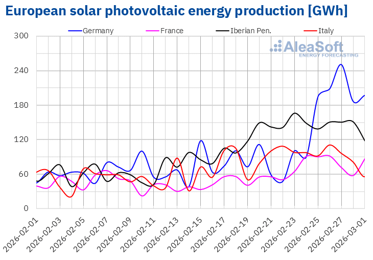 During the week, the markets set solar photovoltaic energy production records for a February day. On February 23, the Spanish market reached its second‑highest production for a February day, 148 GWh. On February 26, the Italian and French markets set all‑time records for solar photovoltaic energy production on a February day, with 110 GWh and 92 GWh, respectively. That same day, the Portuguese market achieved its second‑highest production for a February day, 20 GWh. Meanwhile, on Friday, February 27, the German market set a new all‑time high for this month, with 251 GWh of solar photovoltaic energy production.