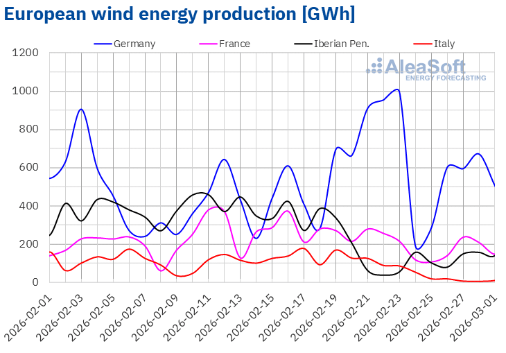Source: Prepared by AleaSoft Energy Forecasting using data from ENTSO-E, RTE, REN, Red Eléctrica and TERNA.During the last week of February, wind energy production decreased in the main European markets compared to the previous week. The Italian market registered the largest decline, 78%, reversing the previous week’s upward trend. The Spanish and French markets followed, with drops of 58% and 38%, respectively. The Portuguese market registered the smallest decline, 14%, while wind energy production in the German market fell by 15%. In the Iberian Peninsula, declines continued for a second consecutive week, while in the French market wind energy production reversed its upward trend after three weeks of increases.