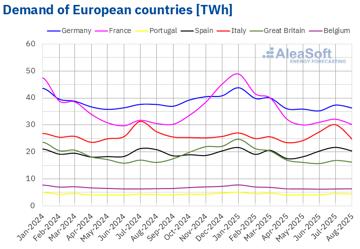 Compared to July 2025, demand also decreased in most major European electricity markets. Italy registered the largest fall, 18%, while Germany registered the smallest, 2.9%. The British, Portuguese, French and Spanish markets registered decreases ranging from 3.8% in Great Britain to 6.3% in Spain. In contrast, in the Belgian market demand increased by 1.2%.