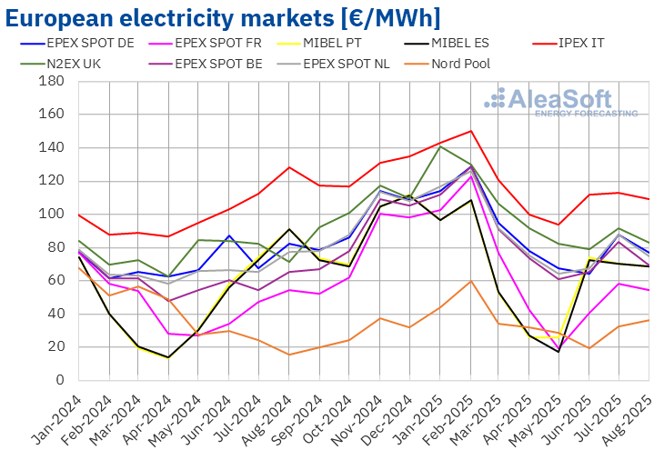 In August 2025, the average monthly price was below €75/MWh in most major European electricity markets. The exceptions were the EPEX SPOT market of Germany, the N2EX market of the United Kingdom and the IPEX market of Italy, whose averages were €76.99/MWh, €82.58/MWh and €108.79/MWh, respectively. The Nord Pool market of the Nordic countries and the EPEX SPOT market of France registered the lowest monthly prices, €36.47/MWh and €54.44/MWh, respectively. In the rest of the European electricity markets analysed at AleaSoft Energy Forecasting, the averages ranged from €68.44/MWh in the MIBEL market of Spain to €74.58/MWh in the EPEX SPOT market of the Netherlands.