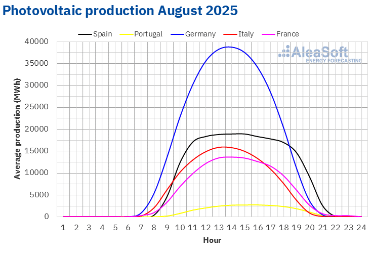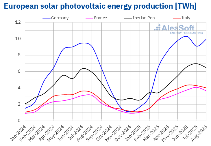 Compared to July 2025, solar photovoltaic energy production increased in Germany, by 10%. By contrast, France, the Iberian Peninsula and Italy registered lower generation than in the previous month. The French market registered the largest fall, 11%, while the Italian market registered the smallest, 6.3%. The Spanish and Portuguese markets reduced their generation by 7.0% and 8.7%, respectively.