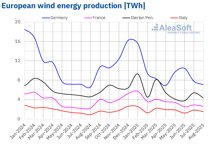 In August 2025, wind energy production increased in most major European electricity markets compared to August 2024. Italy registered the largest increase, 65%, while Germany registered the smallest, 7.5%. In France, generation from this technology grew by 16%. The Iberian Peninsula was the exception, with declines of 3.2% in Portugal and 6.3% in Spain.
