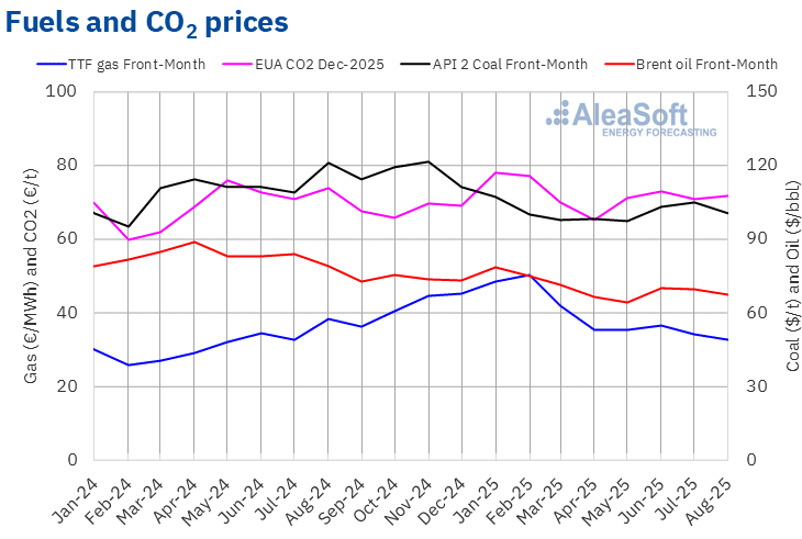 Brent oil futures for the Front Month in the ICE market registered a monthly average price of $67.26/bbl in August 2025. According to data analysed at AleaSoft Energy Forecasting, this monthly average was the lowest since June. This value was 3.3% lower than that reached by Front Month futures for July 2025, which was $69.55/bbl. It was also 15% lower than that corresponding to Front Month futures traded in August 2024, $78.88/bbl.