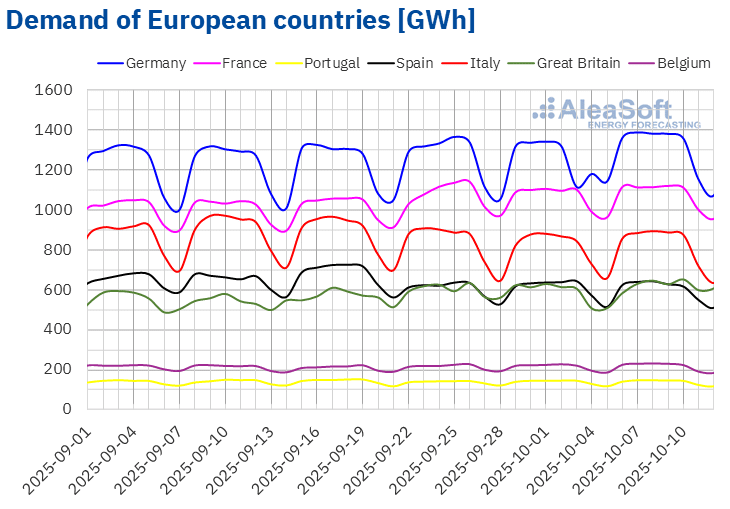 For the week of October 13, AleaSoft Energy Forecasting’s demand forecasts indicate that demand will increase in Italy and Great Britain, while it will fall in Germany, France, Spain, Belgium and Portugal.