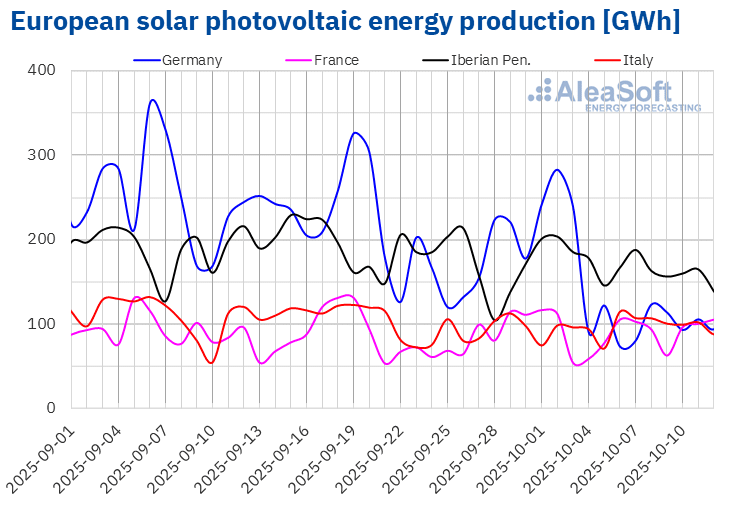 In the second week of October, solar photovoltaic energy production increased in the Italian and French markets compared to the previous week. Italy registered the largest increase, 11%, while in France production rose by 3.4%. Both markets maintained their upward trend for the second consecutive week. In contrast, the German and Iberian markets registered decreases over the same period. Germany registered the largest drop, 50%, followed by Portugal with an 8.5% decline. Spain registered the smallest decrease, 6.8%, maintaining a downward trend for the third consecutive week.