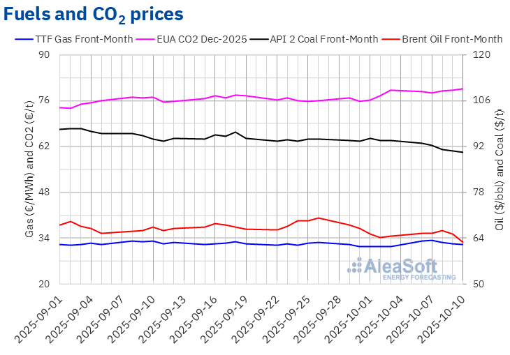 Regarding CO2 emission allowance futures in the EEX market for the reference contract of December 2025, on Tuesday, October 7, they registered their weekly minimum settlement price, €78.30/t. Prices then increased. As a result, on Friday, October 10, they reached their weekly maximum settlement price, €79.69/t. According to data analyzed at AleaSoft Energy Forecasting, this price was 0.7% higher than the previous Friday and the highest since February 15.
