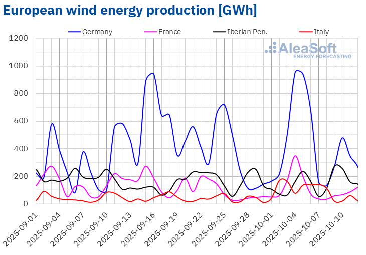 For the week of October 13, AleaSoft Energy Forecasting’s wind energy forecasts indicate an increase in wind energy generation in France, while it will decrease in Portugal, Italy, Spain and Germany.