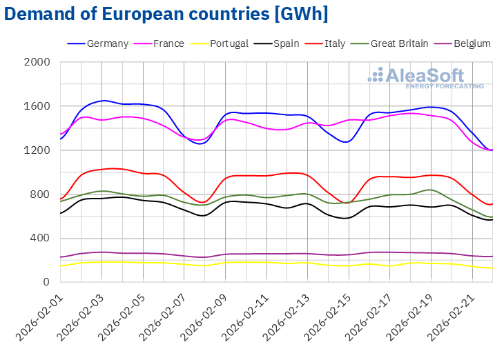 For the week of February 23, according to AleaSoft Energy Forecasting’s demand forecasts, demand will decrease in the German, French, Italian, British and Belgian markets. In contrast, Spain and Portugal will register an increase.