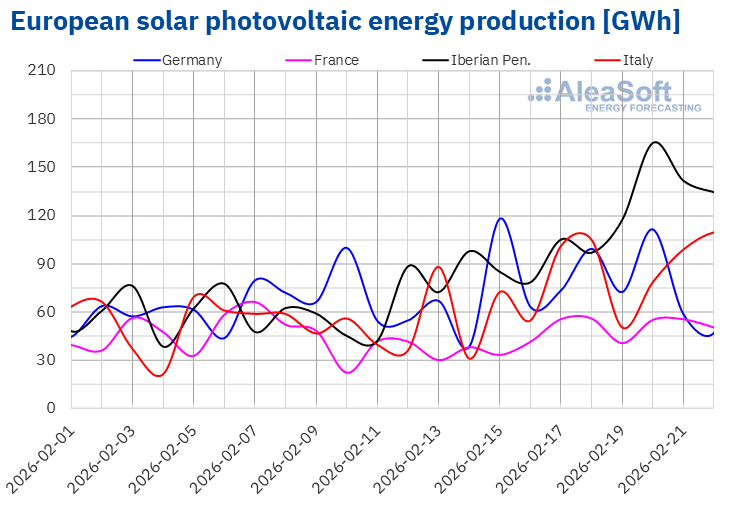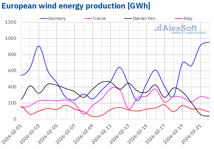 Source: Prepared by AleaSoft Energy Forecasting using data from ENTSO-E, RTE, REN, Red Eléctrica and TERNA.During the week of February 16, wind energy production increased 60% in the German market, after two weeks of declines. In the Italian market, production rose 33%, reversing the previous week’s downward trend. In the French market, wind energy production increased for the third consecutive week, although it showed the smallest growth, 1.7%. In contrast, wind energy production decreased in the Iberian Peninsula, falling 56% in Portugal and 33% in Spain.
