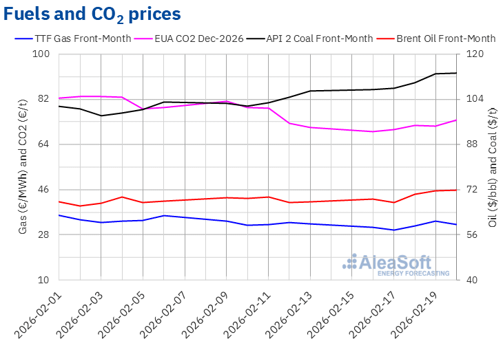Regarding CO2 emission allowance futures in the EEX market for the reference contract of December 2026, they reached their weekly minimum settlement price, €69.16/t, on Monday, February 16. According to data analyzed at AleaSoft Energy Forecasting, this price marked the lowest level since May 2, 2025. During the rest of the third week of February, settlement prices stayed above €70/t and increased in most sessions. As a result, on Friday, February 20, these futures reached their weekly maximum settlement price, €73.79/t, which was 4.4% above the previous Friday’s level.