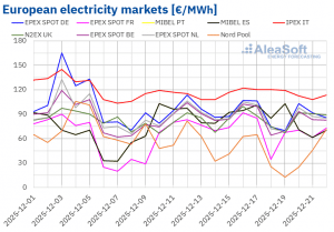 AleaSoft Energy Forecasting, 22 décembre 2025. Au cours de la troisième semaine de décembre, les prix de la plupart des principaux marchés européens de l’électricité