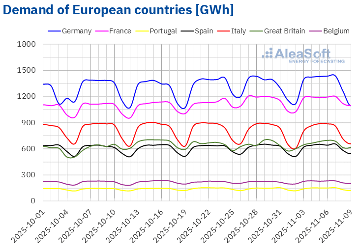 Pour la semaine du 10 novembre, selon les prévisions de la demande d’AleaSoft Energy Forecasting, la demande diminuera sur les marchés français, belge, portugais et allemand. En revanche, elle devrait augmenter en Grande-Bretagne, en Italie et en Espagne.