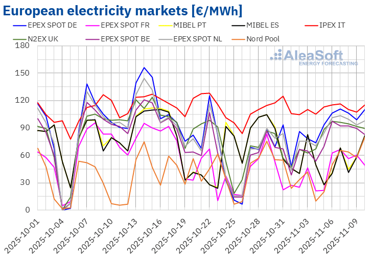 Au cours de la semaine du 3 novembre, les moyennes hebdomadaires ont dépassé 75 €/MWh sur la plupart des marchés électriques européens. Les exceptions ont été les marchés nordique, français, espagnol et portugais, dont les moyennes ont été respectivement de 43,91 €/MWh, 47,71 €/MWh, 52,50 €/MWh et 53,21 €/MWh. Le marché italien a atteint la moyenne hebdomadaire la plus élevée, avec 110,99 €/MWh. Sur les autres marchés analysés par AleaSoft Energy Forecasting, les prix se situaient entre 79,81 €/MWh sur le marché belge et 95,39 €/MWh sur le marché allemand.