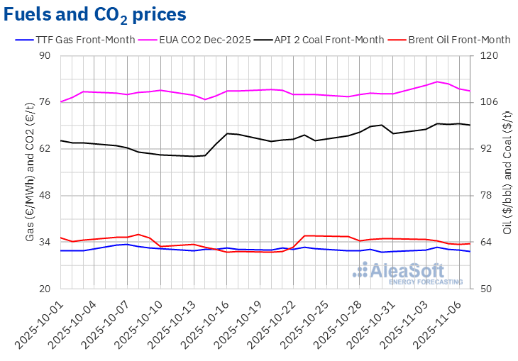 Source : Préparé par AleaSoft Energy Forecasting à partir des données fournies par OMIE, EPEX SPOT, Nord Pool et GME.Brent, combustibles et CO2