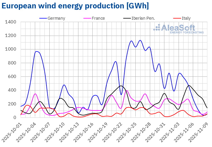 Source : Préparé par AleaSoft Energy Forecasting à partir des données fournies par ENTSO-E, RTE, REN, REE et TERNA.Au cours de la première semaine de novembre, la production éolienne a augmenté sur les marchés de la péninsule ibérique par rapport à la semaine précédente, inversant ainsi la tendance à la baisse observée au cours des sept jours précédents. Le marché espagnol a enregistré la plus forte augmentation, avec 42 %, tandis que le marché portugais a augmenté de 35 %. En revanche, les marchés italien, français et allemand ont prolongé leur baisse pour la deuxième semaine consécutive, avec des baisses respectives de 14 %, 37 % et 55 %.