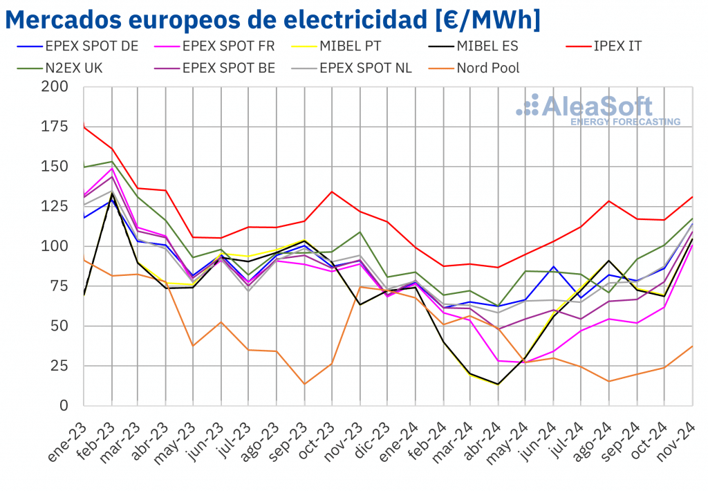 AleaSoft Energy Forecasting, 3 décembre 2024. En novembre, les prix mensuels sur la plupart des grands marchés européens de l’électricité ont dépassé les 100 €/MWh. Sur presque tous les marchés, il s’agissait du prix mensuel le plus élevé depuis au moins mai 2023. L’augmentation des prix du gaz, qui ont atteint la moyenne la plus […]