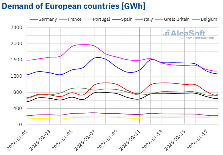 For the week of January 19, according to AleaSoft Energy Forecasting’s demand forecasts, demand will increase in the markets of Great Britain, France, Germany, Belgium and Spain. In contrast, the Portuguese and Italian markets will register a decline in demand.