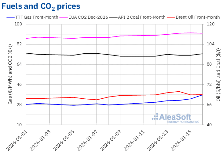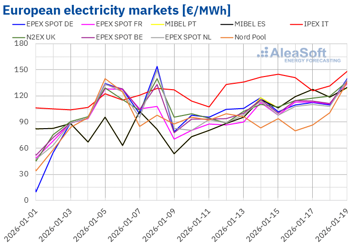 AleaSoft Energy Forecasting, January 19, 2026. In the third week of January, prices in the main European electricity markets registered an upward trend and most of them exceeded €100/MWh as a weekly average, although in many cases they were lower than those of the previous week. On January 17, the Iberian market registered its highest daily price since February 2025. During the week, TTF gas futures reached their highest settlement price since June, CO₂ futures reached their highest settlement price since at least late 2023 and Brent futures reached their highest settlement price since early October. Electricity demand increased in most markets, while renewable energy production declined.