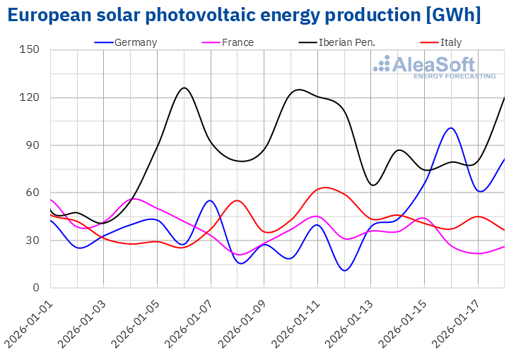 During the third week of January, solar photovoltaic energy production increased in the German and Italian markets compared to the previous week. The German market registered the largest increase, 77%, after two weeks of declines, while the Italian market registered a rise of 7.1%. In contrast, the markets of the Iberian Peninsula and the French market registered declines in production from this technology. Spain and Portugal registered drops of 13% and 23%, respectively, while France accumulated its second consecutive week of declines, with a decrease of 14%.