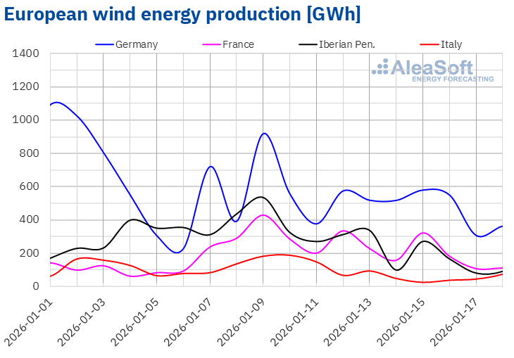 For the penultimate week of January, according to AleaSoft Energy Forecasting’s wind energy forecasts, production from this technology will increase in the markets of the Iberian Peninsula and Italy. However, it will decline in the French and German markets, continuing the downward trend of the previous week.