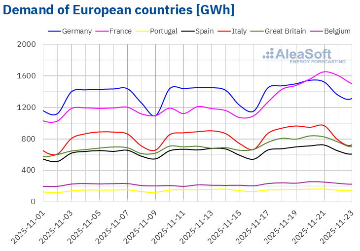 Per l’ultima settimana di novembre, secondo le previsioni dell fabbisogno di AleaSoft Energy Forecasting, il fabbisogno aumenterà nei mercati di Italia, Germania, Spagna, Portogallo e Belgio. D’altra parte, il fabbisogno diminuirà nei mercati di Francia e Gran Bretagna.