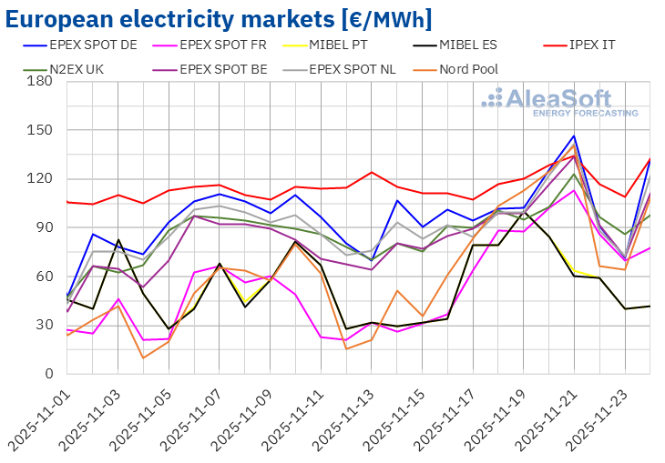 Per quanto riguarda i prezzi giornalieri, il mercato iberico ha raggiunto la media più bassa della settimana tra i mercati analizzati, pari a 39,88 €/MWh, domenica 23 novembre. Negli altri mercati, i prezzi giornalieri sono rimasti sopra i 60 €/MWh nella terza settimana di novembre. Nel mercato italiano, i prezzi giornalieri hanno superato i 105 €/MWh durante la settimana. Anche gli altri mercati analizzati da AleaSoft Energy Forecasting hanno registrato prezzi superiori a 100 €/MWh in alcune sessioni della terza settimana di novembre. La maggior parte dei mercati ha raggiunto i prezzi più alti della settimana venerdì 21 novembre. Quel giorno, il mercato tedesco ha raggiunto la media giornaliera più alta della settimana, pari a 146,48 €/MWh. Il mercato nordico ha raggiunto il prezzo giornaliero più alto dal 15 febbraio, pari a 140,44 €/MWh. I mercati francese e belga hanno registrato i prezzi più alti dal 2 luglio, rispettivamente 112,72 €/MWh e 133,62 €/MWh. Nel caso del mercato italiano, il 21 novembre il prezzo è stato di 134,10 €/MWh, il prezzo giornaliero più alto dal 24 giugno.