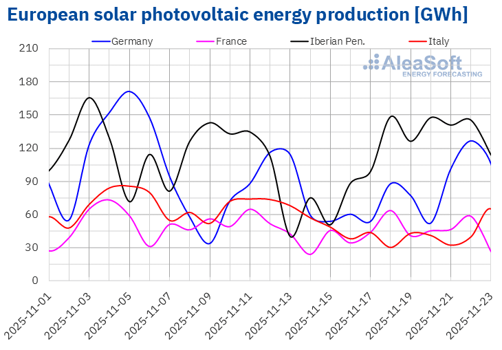 Durante la settimana, i mercati della penisola iberica hanno raggiunto record di produzione solare fotovoltaica per un giorno di novembre. Martedì 18, il mercato spagnolo ha registrato la sua seconda produzione fotovoltaica più alta per un giorno di novembre, con 132 GWh, dopo il record raggiunto il giorno 3, quando sono stati generati 149 GWh. Da parte sua, il Portogallo ha raggiunto il suo massimo di generazione fotovoltaica giornaliera per un mese di novembre il giorno 20, con 18 GWh.