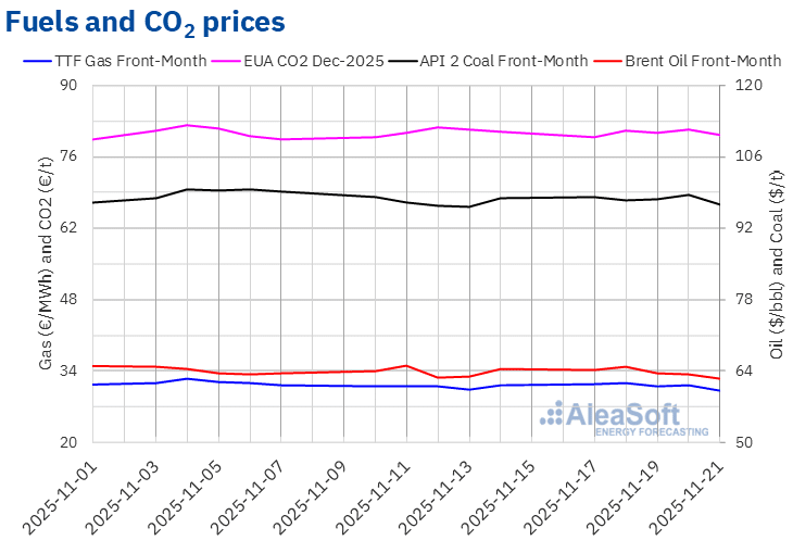 Fonte: Elaborato da AleaSoft Energy Forecasting utilizzando dati provenienti da OMIE, EPEX SPOT, Nord Pool e GME.Brent, combustibili e CO2