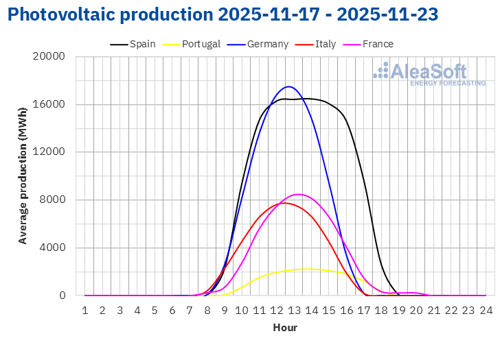 Per la settimana del 24 novembre, secondo le previsioni di produzione solare di AleaSoft Energy Forecasting, la produzione fotovoltaica aumenterà nel mercato italiano, ma si prevede un calo nei mercati tedesco e spagnolo.