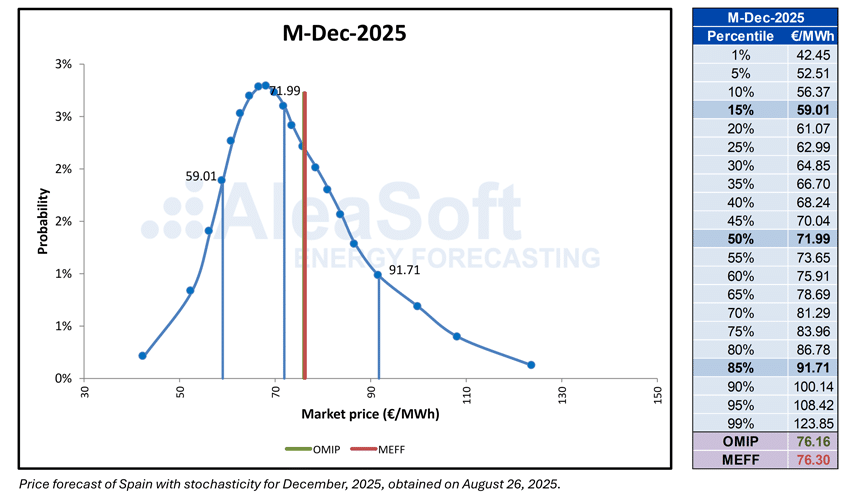 Para o efeito, as previsões de preços são calculadas a partir dos dados relativos à distribuição das variáveis explicativas e das probabilidades que lhes estão associadas. Calcula-se um número suficientemente grande de previsões aleatórias para cada uma das variáveis explicativas. A partir destas simulações, são calculadas as simulações de preços de mercado correspondentes. A partir destas, são calculados percentis da distribuição de preços e distribuições de probabilidades para cada mercadoria mensal, trimestral e anual transaccionada nos mercados de futuros no horizonte de previsão. Para cada período, a distribuição inclui uma referência aos últimos preços transaccionados nos mercados de futuros.